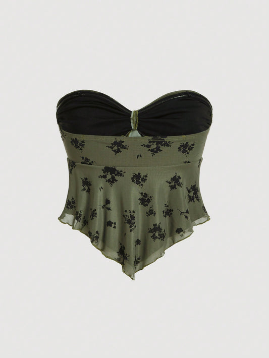 SHEIN MOD Women'S Floral Print Knotted Front Bandeau Boho Vintage Top